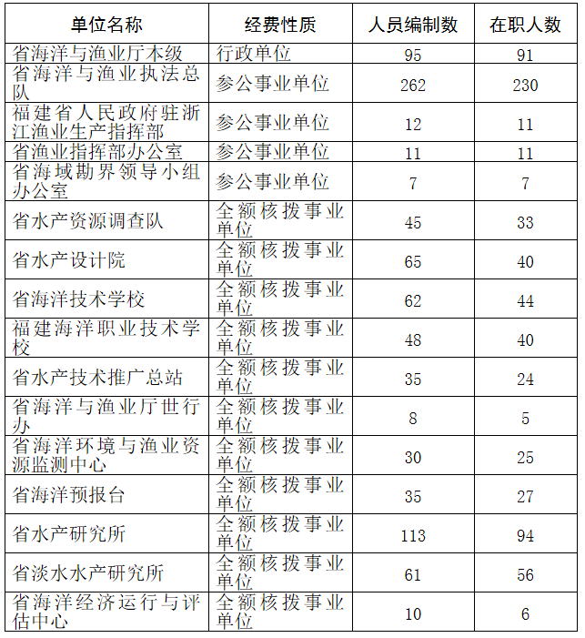 福建省海洋与渔业厅包括14个机关行政处室及15个下属单位,其中:列入2015年部门决算编制范围的单位详细情况见下表: