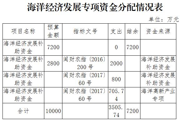 截至2017年12月31日,本年度申报预算10000万元,已到位资金10000万元,实际支出3505.74万元,其中:①根据闽财农指〔2016〕200号,2017年度省海洋经济发展专项资金提前下达补助资金2000万元;②专项资金1505.74万元资金分别为800万来源于“海洋经济发展专项资金”和705.74万来源于“海洋高新产业专项资金”;结余7200万元。