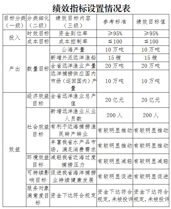 资金安排与目标任务相匹配,采用量化指标分别从新增远洋渔业从业人员数、全省远洋渔业产量等多方面进行细化指标设置。