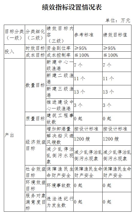 资金安排与目标任务相匹配,采用量化指标分别从新建中心一级渔港数量、新建二级渔港数量、新建三级渔港数量、推进建设中心一级渔港数量进行细化指标设置。