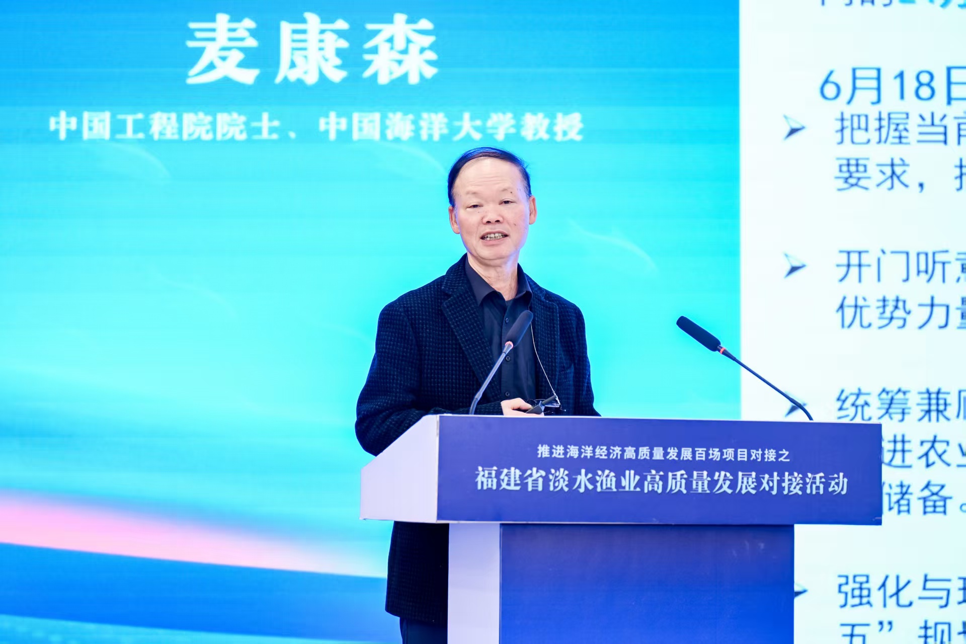 11月22日,由福建省海洋与渔业局主办的推进海洋经济高质量发展百场项目对接之福建省淡水渔业高质量发展对接活动在福州顺利举行。福建省海洋与渔业局党组书记、局长颜志煌,中国科学院水生生物研究所党委书记、研究员解绶启参加活动并致辞。中国工程院院士、中国海洋大学教授麦康森参加活动并作主旨报告。福建省海洋与渔业局党组成员、副局长刘庆丰主持致辞环节。
