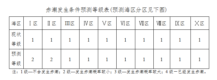 综上所述,此种天气形势不利于我省沿海赤潮的发生。未来三天我省沿海赤潮发生条件预测等级见下表。