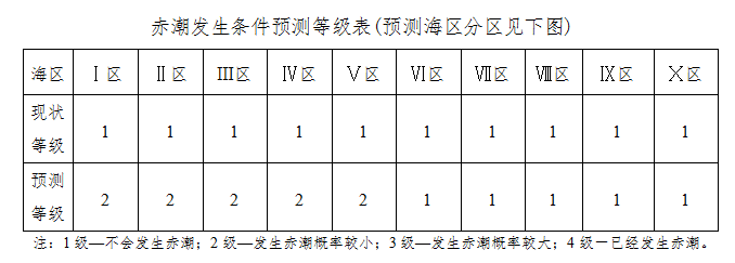 综上所述,此种天气形势不利于我省沿海赤潮的发生。未来四天我省沿海赤潮发生条件预测等级见下表。