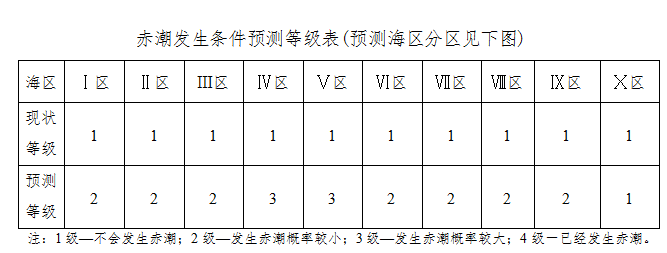 综上所述,此种天气形势有利于我省沿海赤潮的发生。未来四天我省沿海赤潮发生条件预测等级见下表。