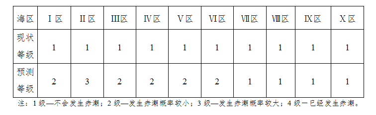 赤潮发生条件预测等级表(预测海区分区见下图)