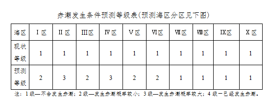 当前预报天气形势有利于我省沿海赤潮的发生。未来四天我省沿海赤潮发生条件预测等级见下表。