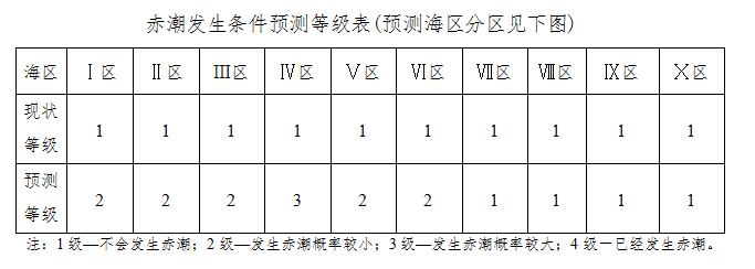当前预报天气形势不利于我省沿海赤潮的发生。未来三天我省沿海赤潮发生条件预测等级见下表。