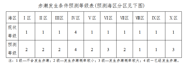 当前预报天气形势有利于我省平潭沿海赤潮的维持和其他沿海赤潮的发生。未来两天我省沿海赤潮发生条件预测等级见下表。