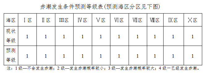 当前预报天气形势不利于我省沿海赤潮的发生。未来三天我省沿海赤潮发生条件预测等级见下表。