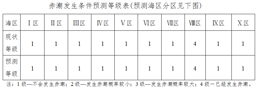 当前预报天气形势不利于厦门沿海区域赤潮的发展和其他沿海区域赤潮的发生。未来两天我省沿海赤潮发生条件预测等级见下表。