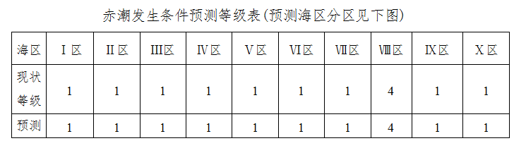 当前预报天气形势不利于厦门沿海区域赤潮的发展和其他沿海区域赤潮的发生。未来两天我省沿海赤潮发生条件预测等级见下表。