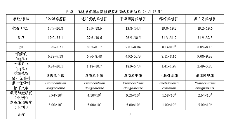 4月27-28日,我局对三沙湾、连江黄岐、平潭沿海、福清、莆田等地的5个重点养殖区开展赤潮加密监视监测,监测预警结果如下: