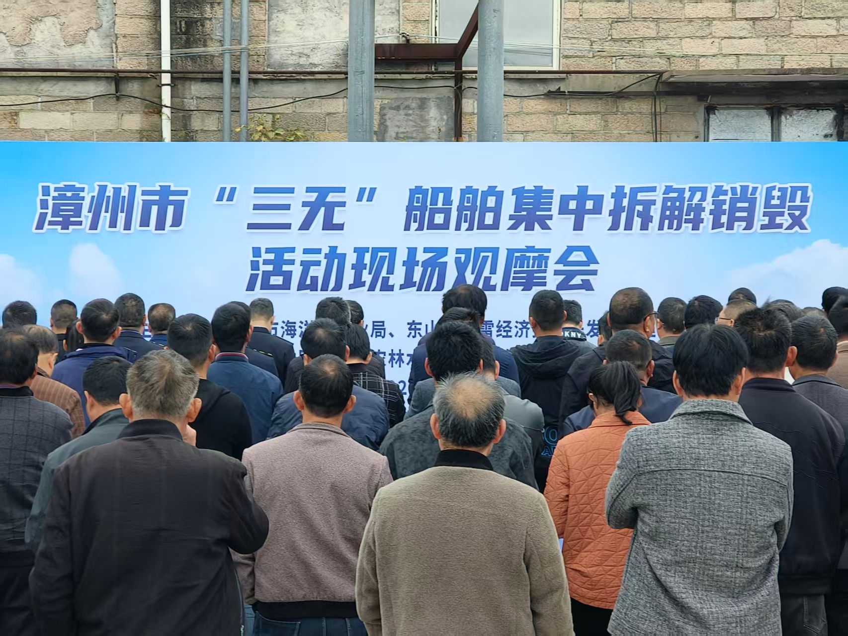 继1月7日至8日执法人员以“四不两直”方式突击检查57家船舶修造企业,并成功查获一批涉嫌非法建造空壳船后,1月30日,漳州市海上船舶安全管理协调机制组织有关县区,对查获并核查确认的29艘“三无”船舶进行集中拆解,市、县两级海洋渔业、公安、工信、市场监管等部门相关负责人及全市87家船舶修造企业负责人参加现场会,共同接受履行监管职责与合法合规经营的警示教育。