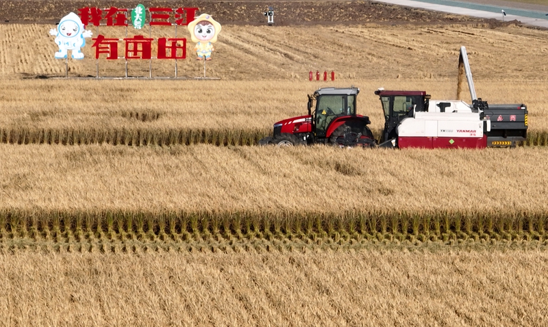 2024年10月13日,在北大荒集团黑龙江七星农场有限公司万亩水稻大地号中,无人驾驶收割机和无人驾驶接粮车在工作(无人机照片)。新华社发(党爱河 摄)
