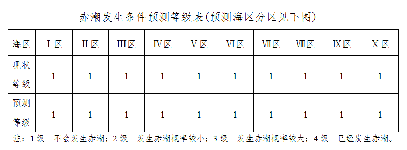 当前预报天气形势不利于我省沿海区域赤潮的发生。未来四天我省沿海赤潮发生条件预测等级见下表。