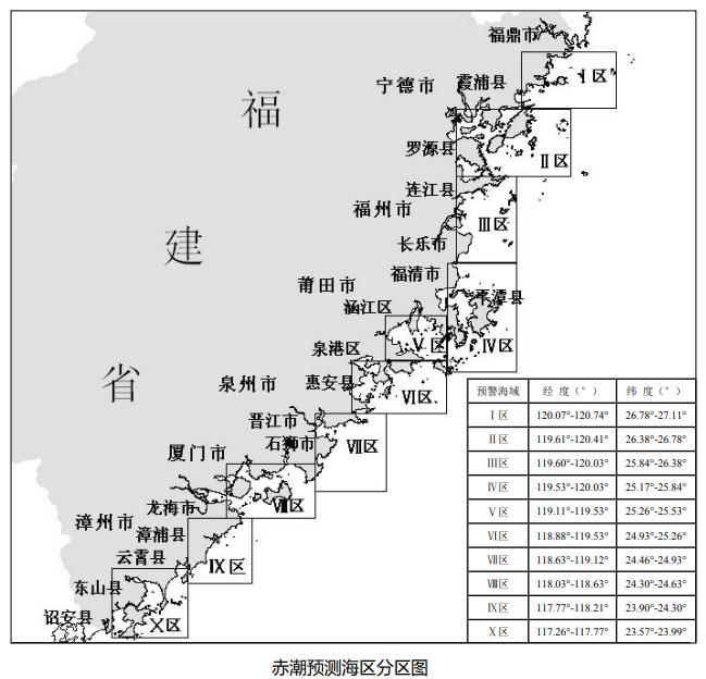 综上所述,此种天气形势有利于我省北部沿海赤潮的发生。未来三天我省沿海赤潮发生条件预测等级见下表。