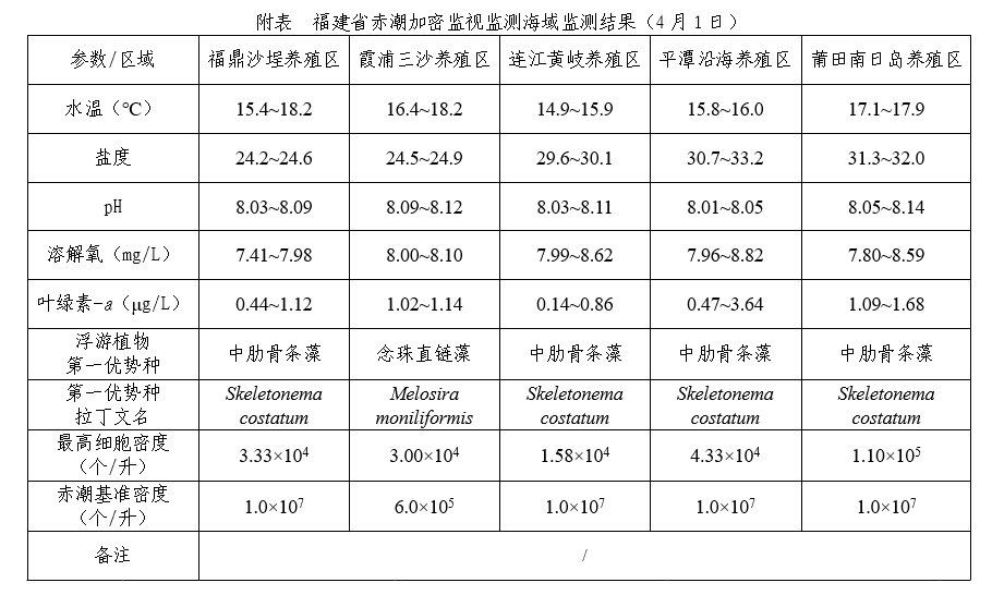 4月1日,对福鼎沙埕、霞浦三沙、连江黄岐、平潭沿海、莆田南日岛等5个重点养殖区开展赤潮加密监测,共设置监测站点24个,监测指标包括水温、盐度、pH、溶解氧、叶绿素-a以及浮游植物优势种等,监测预警结果如下: