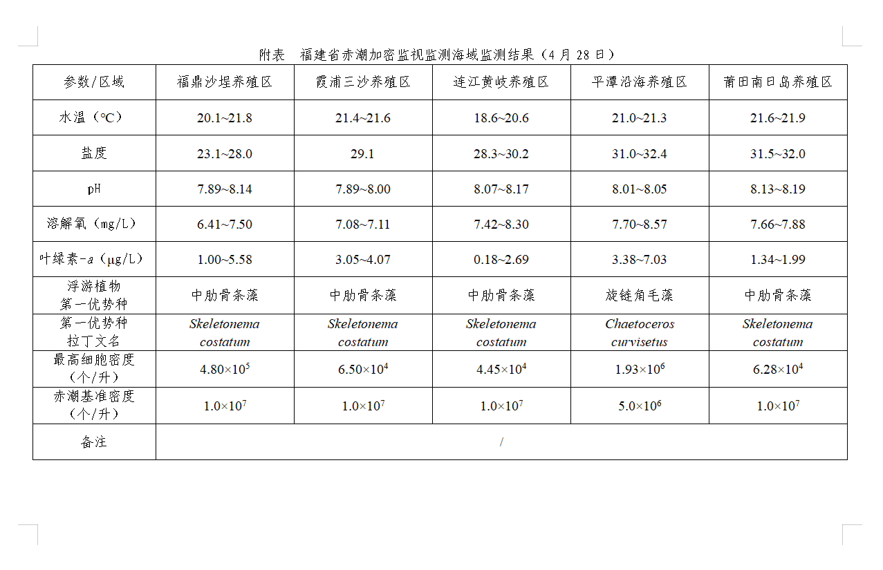 4月28日,对福鼎沙埕、霞浦三沙、连江黄岐、平潭沿海、莆田南日岛等5个重点养殖区开展赤潮加密监测,共设置监测站点24个,监测指标包括水温、盐度、pH、溶解氧、叶绿素-a以及浮游植物优势种等,监测预警结果如下: